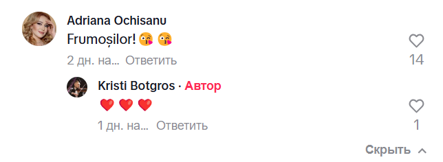 „Frumoșilor”, a scris Adriana Ochișanu, iar Cristian i-a răspuns mamei sale cu 3 inimioare.