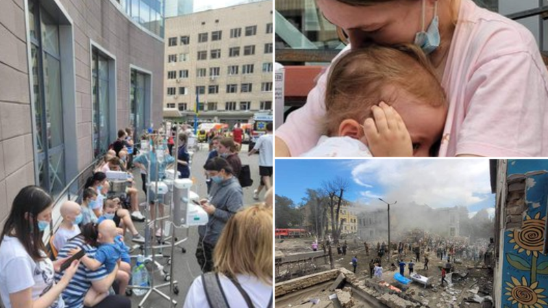 Presa ucraineană a publicat imagini cu mame și copii bolnavi, evacuați din clădirea bombardată și îngrijiți în curtea spitalului.