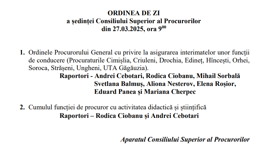9:12 Subiectul 1 cu privire la ordinele Procurorului General cu privire la asigurarea interimatelor unor funcții de conducere (Procuraturile Cimișlia, Criuleni, Drochia, Edineț, Hîncești, Orhei, Soroca, Strășeni, Ungheni, UTA Găgăuzia), transferat pentru o altă ședință.