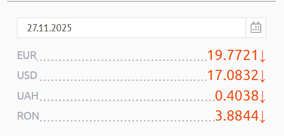 Leul românesc a fost stabil la o valoare de 3.8844 lei moldovenești, iar Hrivna ucraineană a scăzut ușor, ajungând la o valoare de 0.4038 lei moldovenești.