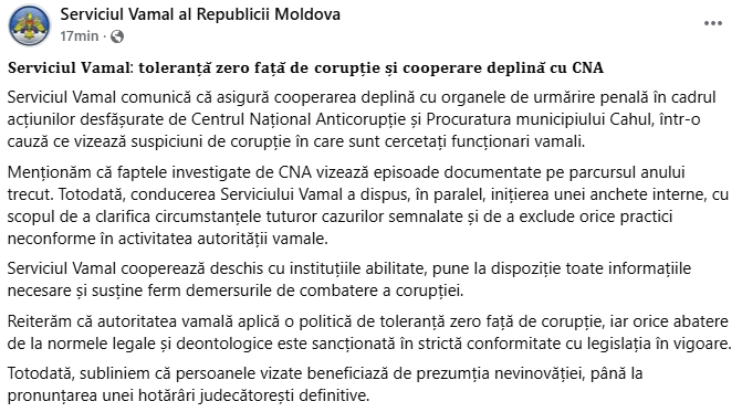 „Serviciul Vamal comunică că asigură cooperarea deplină cu organele de urmărire penală în cadrul acțiunilor desfășurate de Centrul Național Anticorupție și Procuratura municipiului Cahul, într-o cauză ce vizează suspiciuni de corupție în care sunt cercetați funcționari vamali.