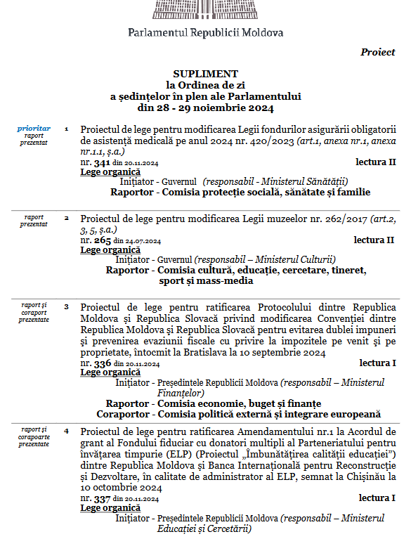 14:00 Deputații au aprobat, în lectura a II-a, proiectul de lege pentru ratificarea Protocolului dintre Republica Moldova și Republica Slovacă privind modificarea Convenției dintre Republica Moldova şi Republica Slovacă pentru evitarea dublei impuneri şi prevenirea evaziunii fiscale cu privire la impozitele pe venit şi pe proprietate, întocmit la Bratislava la 10 septembrie 2024 nr. 336.