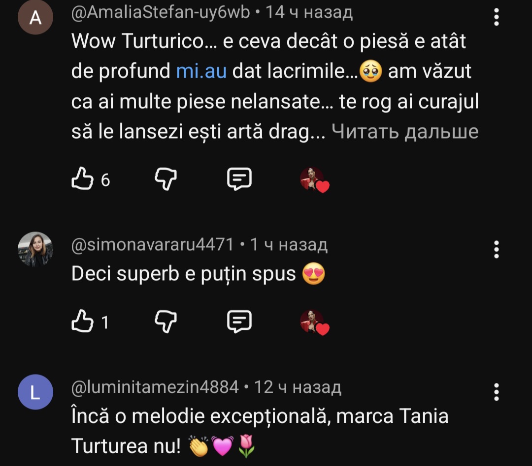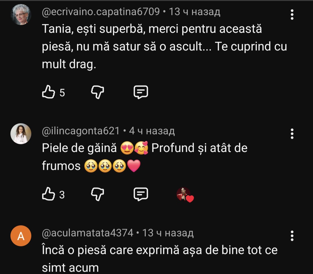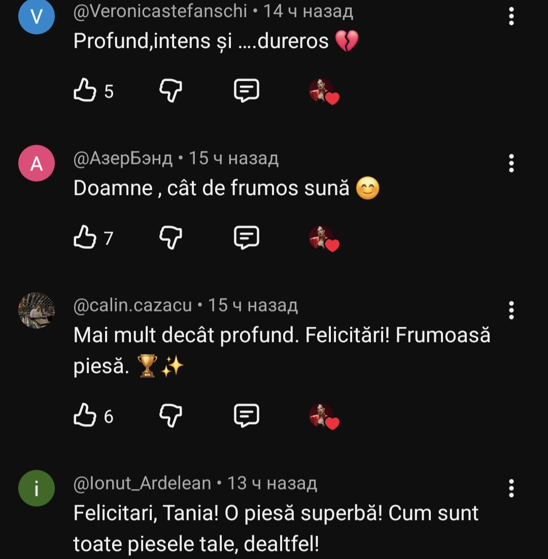„Felicitari Tania! Ce faci tu e pura arta!”, „Profund, intens și... dureros”, „Piele de găină... Profund și atât de frumos!”, au scris fanii.