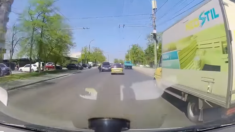 Camera de bord a unei alte mașini a surprins momentul în care șoferul augtomobilului de model Volkswagen încearcă să depășească un biciclist, moment în care în întâmpinare se deplasa o altă mașină, pe banda sa. Cel de-al doilea șofer a reușit să evite impactul, în ultimul moment.