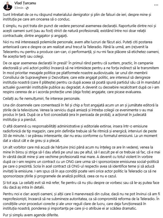 Pentru noi e clar: acești oameni, și alții care îi manevrează din culise, dacă nu ne pot învinui că am fi neprofesioniști, încearcă să ne submineze autoritatea, ca să compromită reforma de la Teleradio. În condițiile unor proceduri corecte și ale unor reguli clare de lucru, care deja funcționează în instituția noastră, ponderea și importanța pe care și-o atribuie ei ar scădea dramatic”, a scris Țurcanu.
