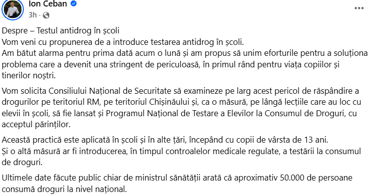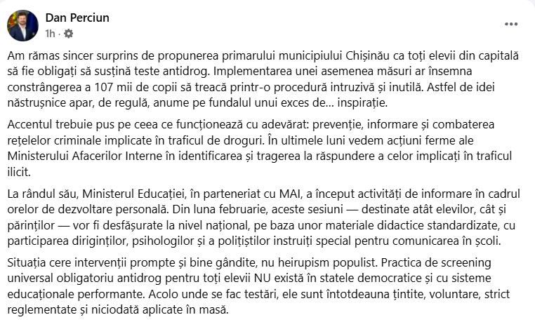 „Am rămas sincer surprins de propunerea primarului municipiului Chișinău ca toți elevii din capitală să fie obligați să susțină teste antidrog. Implementarea unei asemenea măsuri ar însemna constrângerea a 107 mii de copii să treacă printr-o procedură intruzivă și inutilă. Astfel de idei năstrușnice apar, de regulă, anume pe fundalul unui exces de… inspirație.