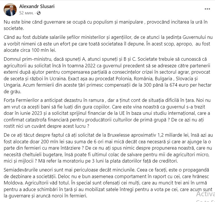 Semiadevărurile uneori sunt mai periculoase decât minciunile. Ceea ce faceți, este o propagandă de dezbinare a societății. Deloc nu e bun un asemenea comportament în raport cu cei, care hrănesc Moldova. Agricultorii văd totul. În special sunt ofensați cei mulți, care au muncit trei ani în urmă pentru a aduce schimbări în țară și au mobilizat sate întregi pentru a-i vota pe cei, care acum sunt la guvernare și aruncă noroi în fermieri”, a declarat Alexandr Slusari.