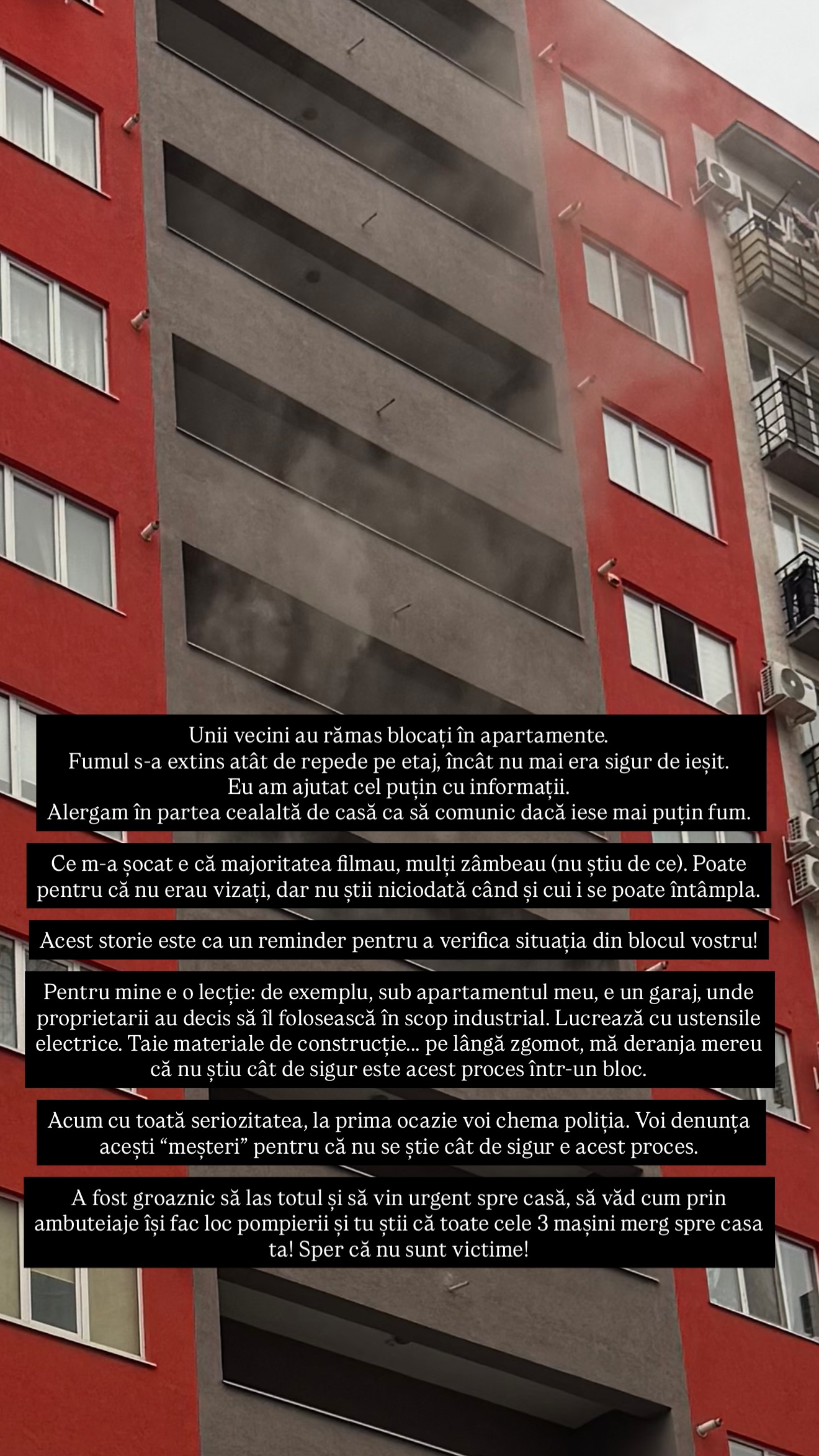 Potrivit declarațiilor sale, incendiul a pornit de la un transformator care a cedat și s-a aprins, iar fumul dens a cuprins întreaga scară, făcând imposibilă evacuarea imediată pentru mai mulți locatari. „Unii vecini au rămas blocați în apartamente”, a scris Cristina, vizibil afectată de cele întâmplate.