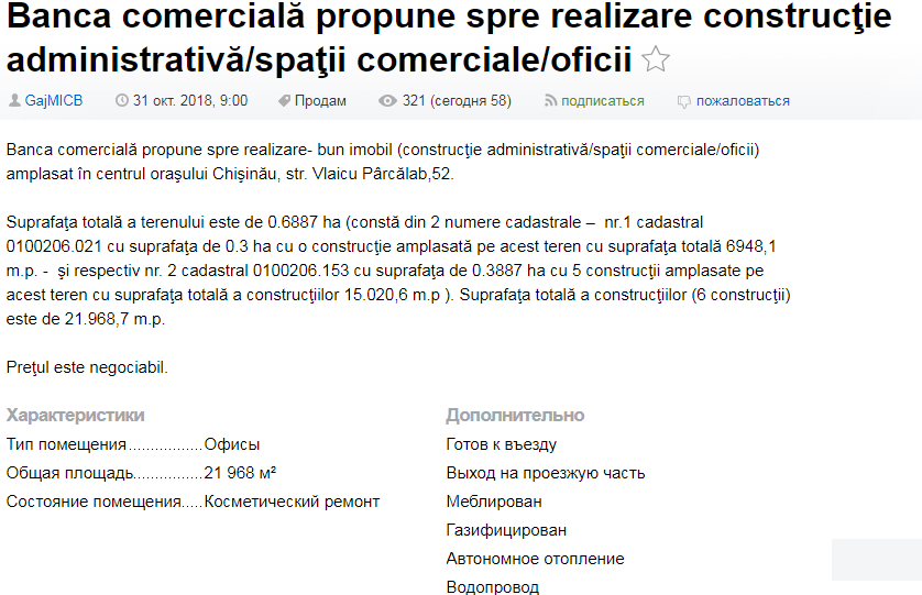 Vedeți mai jos lista de imobile scoase în vânzare de Moldindconbank la data de 14 septembrie curent, printre care se află și terenul de pe str. Vlaicu Pârcălab, nr. 52.
