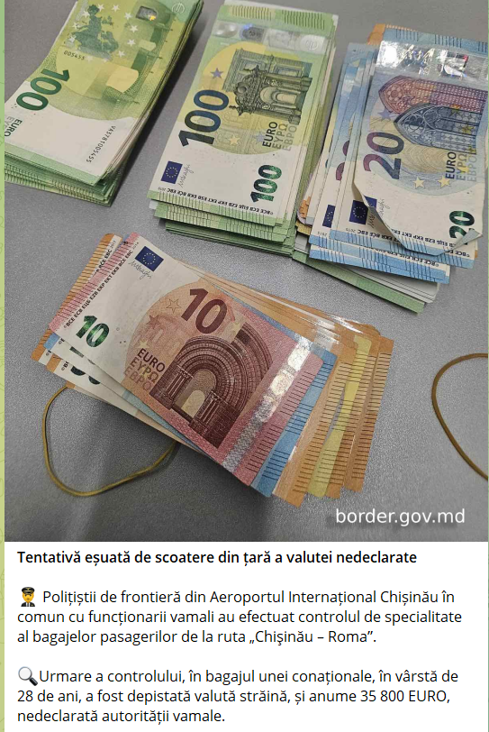 Urmare a controlului, în bagajul unei conaționale, în vârstă de 28 de ani, a fost depistată valută străină, și anume 35 800 EURO, nedeclarată autorității vamale.