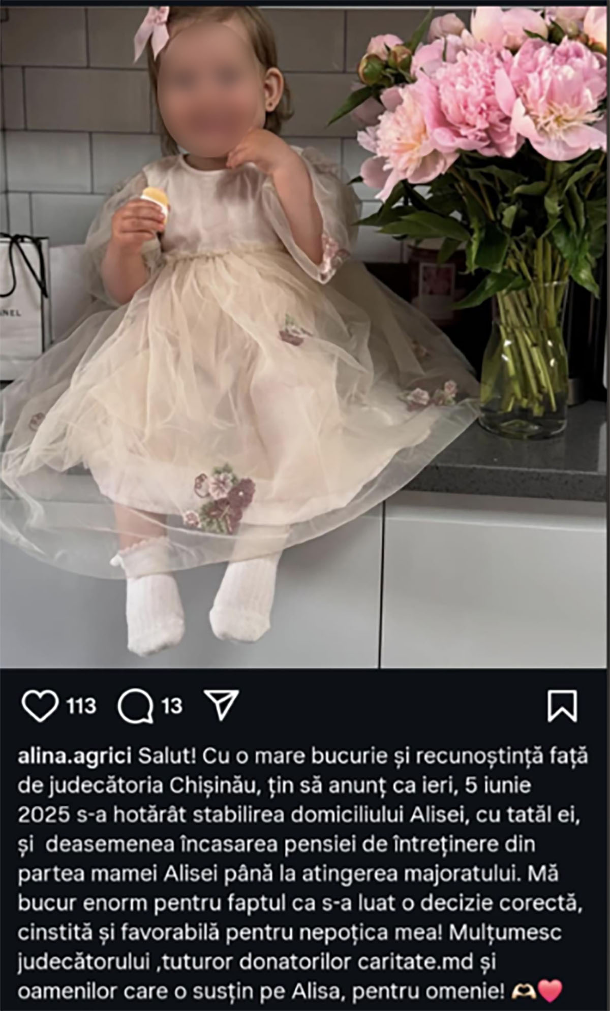 „Cu o mare bucurie și recunoștință față de judecătoria Chișinău, țin să anunț ca ieri, 5 iunie 2025 s-a hotărât stabilirea domiciliului Alisei, cu tatăl ei și, deasemenea, încasarea pensiei de întreținere din partea mamei Alisei până la atingerea majoratului.