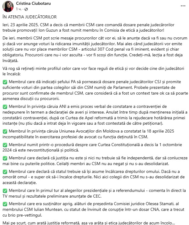 „Ieri, 23 aprilie 2025, CSM a decis că membrii CSM care comandă dosare penale judecărorilor trebuie promovați! Ion Guzun a fost numit membru în Comisia de etică a judecătorilor!