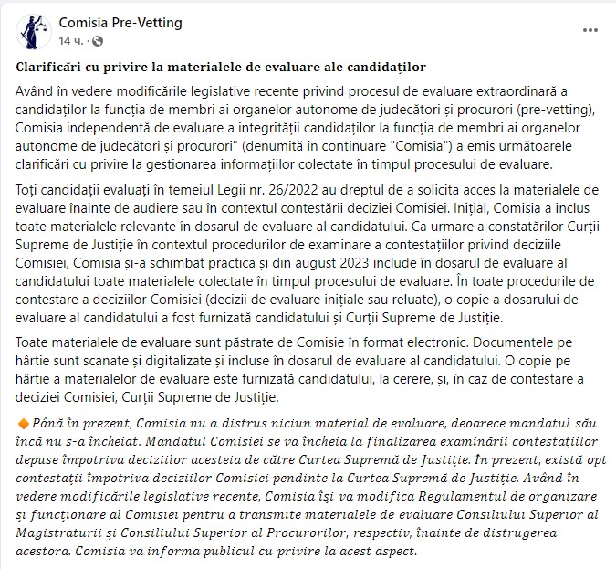 Până în prezent, Comisia nu a distrus niciun material de evaluare, deoarece mandatul său încă nu s-a încheiat. Mandatul Comisiei se va încheia la finalizarea examinării contestațiilor depuse împotriva deciziilor acesteia de către Curtea Supremă de Justiție. În prezent, există opt contestații împotriva deciziilor Comisiei pendinte la Curtea Supremă de Justiție. Având în vedere modificările legislative recente, Comisia își va modifica Regulamentul de organizare și funcționare al Comisiei pentru a transmite materialele de evaluare Consiliului Superior al Magistraturii și Consiliului Superior al Procurorilor, respectiv, înainte de distrugerea acestora. Comisia va informa publicul cu privire la acest aspect”, se arată în nota Comisiei.