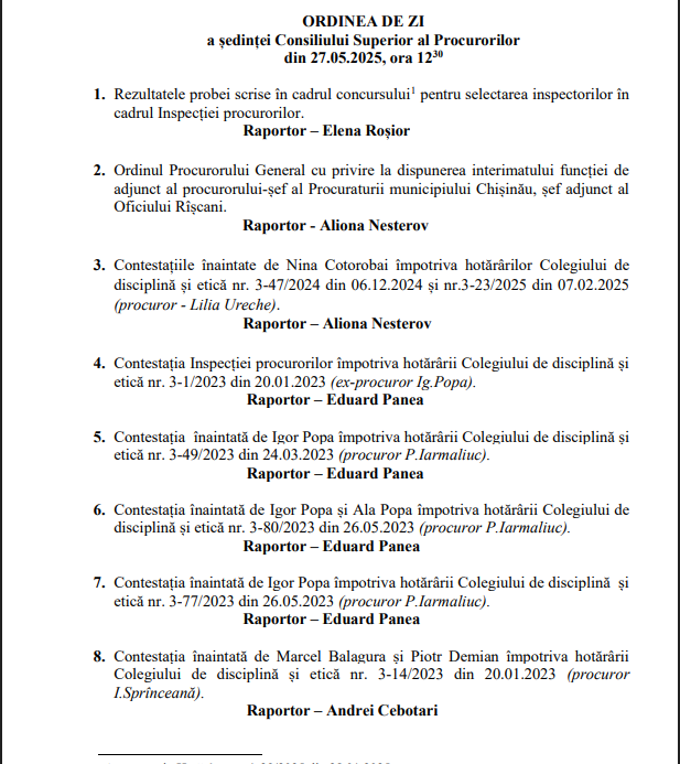 CSP examinează în ședință închisă contestația înaintată de Igor Popa împotriva hotărârii Colegiului de disciplină și etică nr. 3-49/2023 din 24.03.2023 (procuror Petru Iarmaliuc).