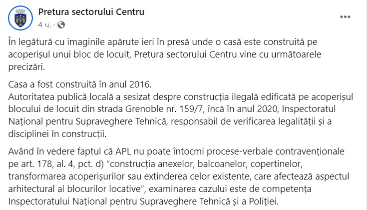 Autoritatea publică locală a sesizat despre construcția ilegală edificată pe acoperișul blocului de locuit din strada Grenoble nr. 159/7, încă în anul 2020, Inspectoratul Național pentru Supraveghere Tehnică, responsabil de verificarea legalității și a disciplinei în construcții.
