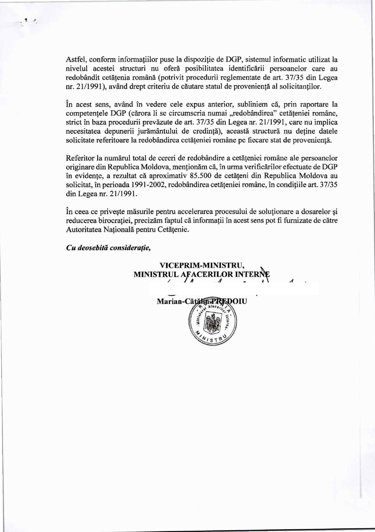 „Astăzi, peste 850.000 de basarabeni sunt din nou cetățeni români. În următorii 2-3 ani, dacă autoritățile își fac datoria, acest număr va ajunge la 1.000.000”, a conchis parlamentarul.