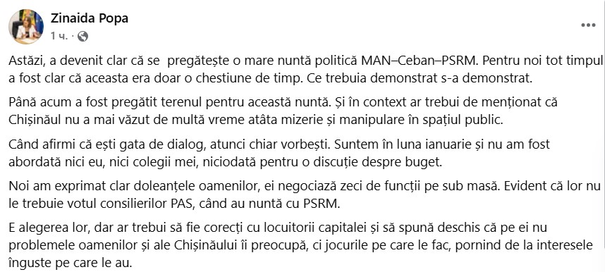 E alegerea lor, dar ar trebui să fie corecți cu locuitorii capitalei și să spună deschis că pe ei nu problemele oamenilor și ale Chișinăului îi preocupă, ci jocurile pe care le fac, pornind de la interesele înguste pe care le au”, a scris Zinaida Popa.