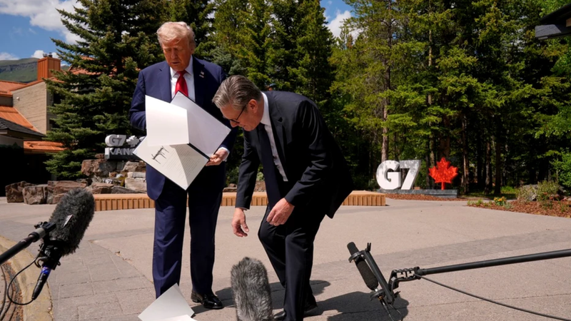 Pe reșelele sociale s-a mai viralizat un moment de la Summitul G7: cel în care, la o conferință de presă comună cu Keir Starmer, Donald Trump a scăpat pe jos documentul reprezentând acordul comercial cu Marea Britanie, chiar în clipa în care urma să-l arate jurnaliștilor.