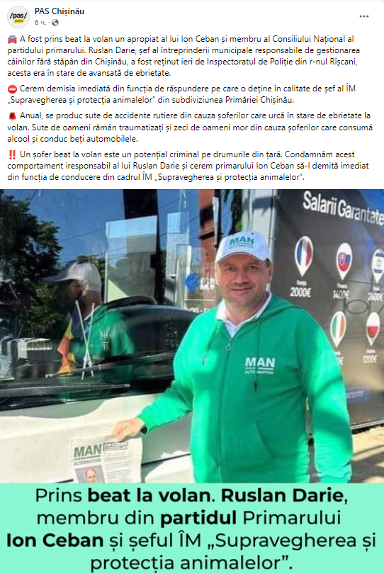 „Un șofer beat la volan este un potențial criminal pe drumurile din țară. Condamnăm acest comportament iresponsabil al lui Ruslan Darie și cerem primarului Ion Ceban să-l demită imediat din funcția de conducere din cadrul ÎM „Supravegherea și protecția animalelor””, menționează consilerii PAS din CMC.
