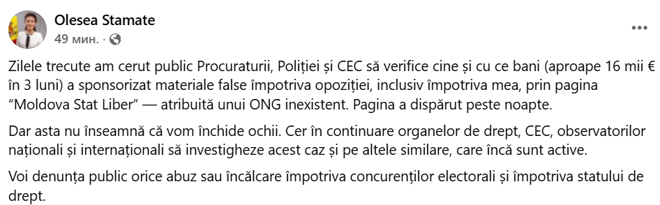 „Zilele trecute am cerut public Procuraturii, Poliției și CEC să verifice cine și cu ce bani (aproape 16 mii € în 3 luni) a sponsorizat materiale false împotriva opoziției, inclusiv împotriva mea, prin pagina “Moldova Stat Liber” — atribuită unui ONG inexistent. Pagina a dispărut peste noapte.