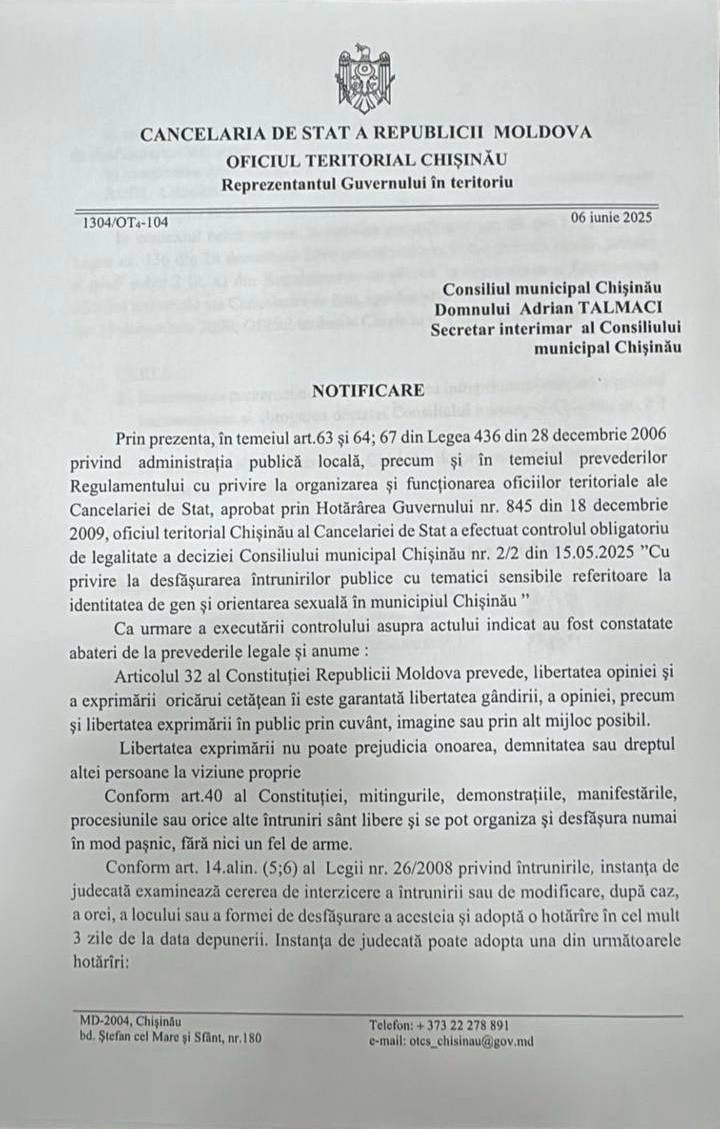 (doc) Cancelaria de Stat cere anularea deciziei CMC prin care marșurile LGBT au fost interzise. Ceban: PAS și sluga lor docilă. Nu vom face acest lucru