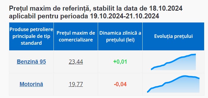 Prin urmare, în perioada 19-21.10.2024 un litru de benzină va costa 23,44 lei, iar cel de motorină - 19.77 lei.