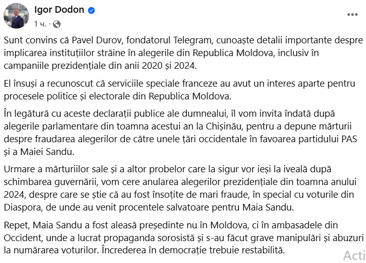 „Sunt convins că Pavel Durov, fondatorul Telegram, cunoaște detalii importante despre implicarea instituțiilor străine în alegerile din Republica Moldova, inclusiv în campaniile prezidențiale din anii 2020 și 2024.