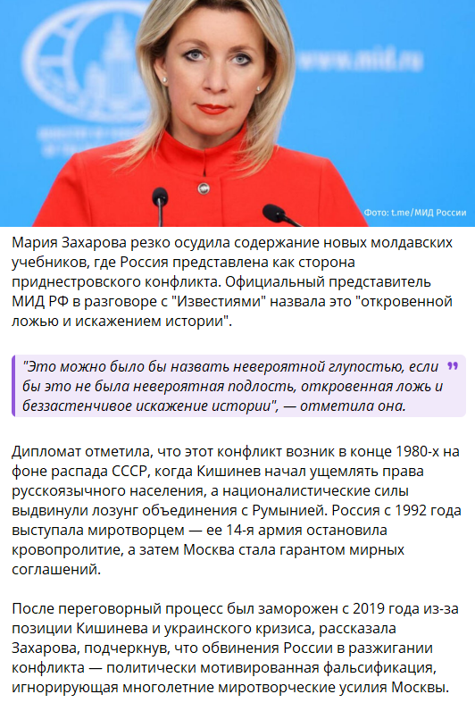 Purtătoarea de cuvânt a Ministerului rus de Externe, Maria Zaharova, a criticat noile manualele apărute în Republica Moldova, care menționează Rusia ca parte implicată în conflictul transnistrean și a acuzat Chișinăul de promovarea minciunii și denaturarea istoriei.