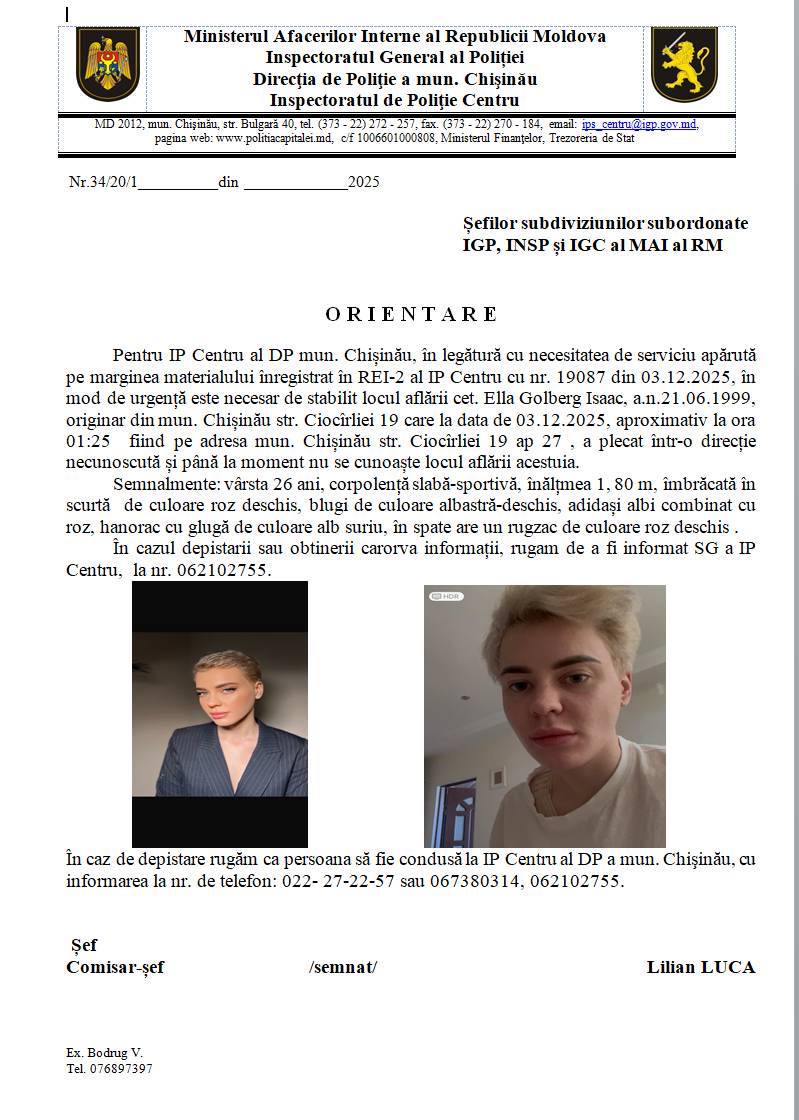 Potrivit orientării, publicate de canalul Ungureanu 112, tânăra a ieșit din locuinţa sa situată pe strada Ciocârliei din cartierul Telecentru din capitală, în noaptea de 3 decembrie, în jurul orei 01:25, fără a comunica vreo destinaţie. De atunci, rudele şi apropiaţii nu cunosc nimic despre locul unde se află.
