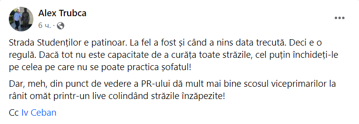 „Strada Studenților e patinoar. La fel a fost și când a nins data trecută. Deci e o regulă. Dacă tot nu este capacitate de a curăța toate străzile, cel puțin închideți-le pe acelea pe care nu se poate practica șofatul!”, a scris deputatul Alexandr Trubca pe rețele.