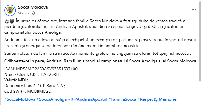 „În urmă cu câteva ore, întreaga familie Socca Moldova a fost zguduită de vestea tragică a pierderii jucătorului nostru Andrian Apostol, unul dintre cei mai longevivi și dedicați jucători ai campionatului Socca Amoliga.