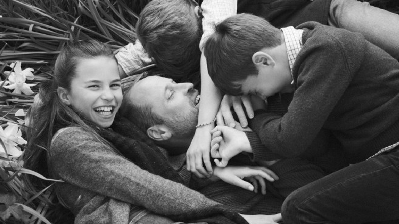 Una din fotografiile postate postate de familia regală este un portret în care prințul William în ține pe după umeri pe George, fiul cel mare, și pe Charlotte. În timp ce Louis, mezinul familiei, stă în față îmbrățișat de sora sa. A doua poză este o imagine alb-negru în care cei patru stau întinși pe iarbă, în timp și ce râd și se îmbrățișează.