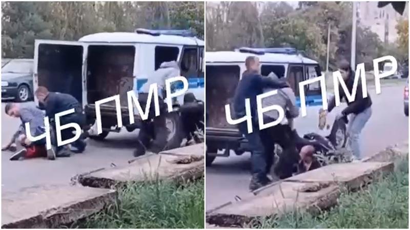 În timp ce polițiștii îi încătușează pe doi bărbați, al treilea sare la bătaie la unul dintre ei. O tânără care era martoră la scenă a strigat după ajutor.