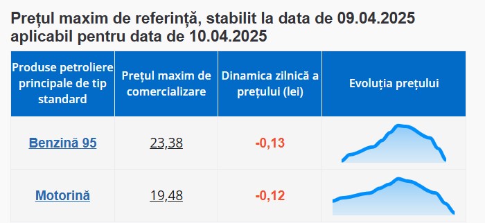 Agenția Națională pentru Reglementare în Energetică a afișat prețuri și mai mici la carburanți pentru mâine, 10 aprilie. Astfel, motorina se ieftinește cu 12 bani, iar prețul benzinei scade cu 13 bani.