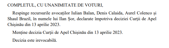 „Completul, cu unanimitate de voturi, respinge recursurile avocaţilor Iulian Balan, Denis Calaida, Aurel Colenco și Shaul Brazil, în numele lui Ilan Șor, declarate împotriva deciziei Curţii de Apel Chișinău din 13 aprilie 2023.