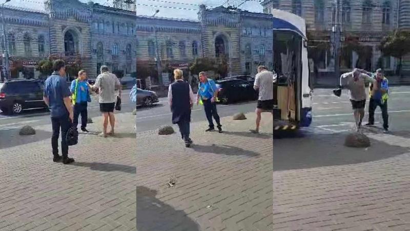 (video) Un șofer de troleibuz și un pieton s-au luat la pumni, la stația din fața primăriei capitalei