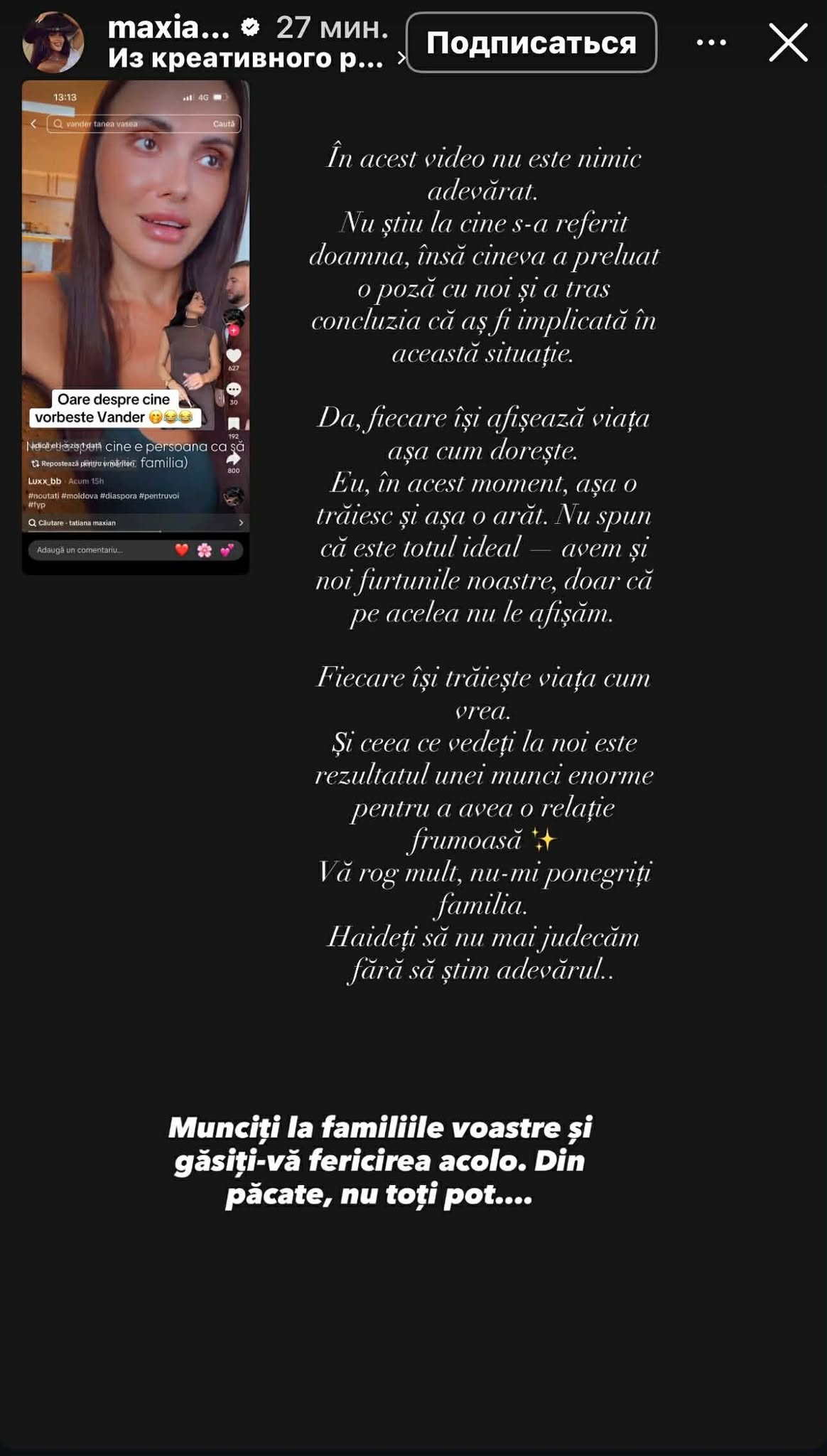 Munciți la familiile voastre și găsiți-vă fericirea acolo. Din păcate, nu toți pot...”, a scris Tatiana Maxian.