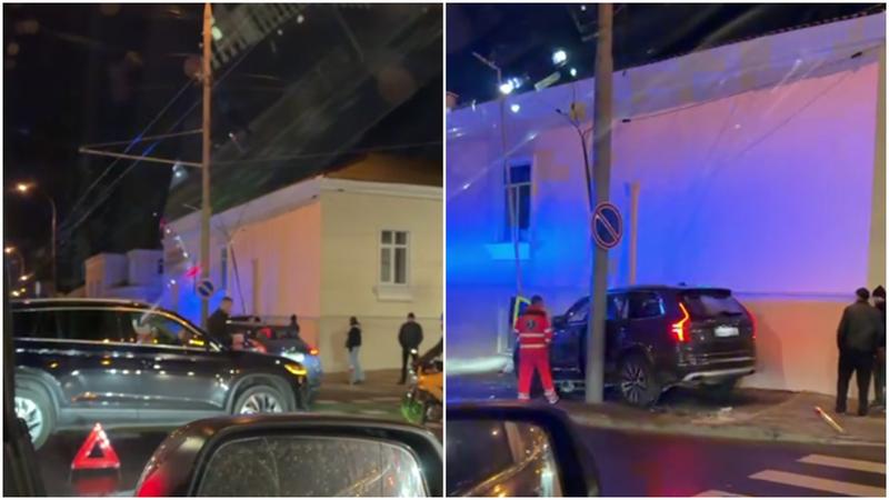 Una dintre mașini a ajuns pe trotuar, fiind strânsă între un pilon și peretele unei clădiri.