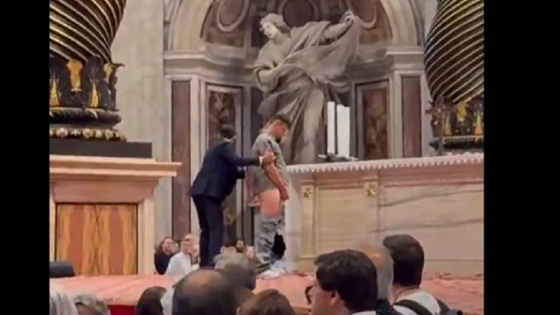 Individul a sărit peste barierele de securitate care interzic accesul la altar și, ajuns în fața baldachinului baroc, și-a dat jos pantalonii înainte de a comite gestul obscen.