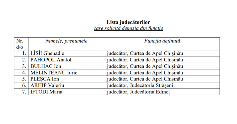Este vorba despre un magistrat din cadrul Judecătoriei Strășeni, unul din care activează în cadrul Judecătoriei Edineț și alți 5 de la Curtea de Apel Chișinău.