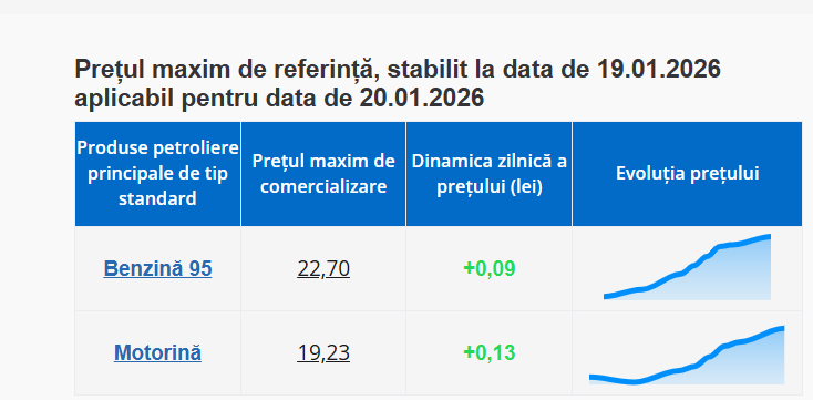 Astfel, un litru de benzină va costa, mâine, 22,70 lei, iar unul de motorină - 19,23 lei.