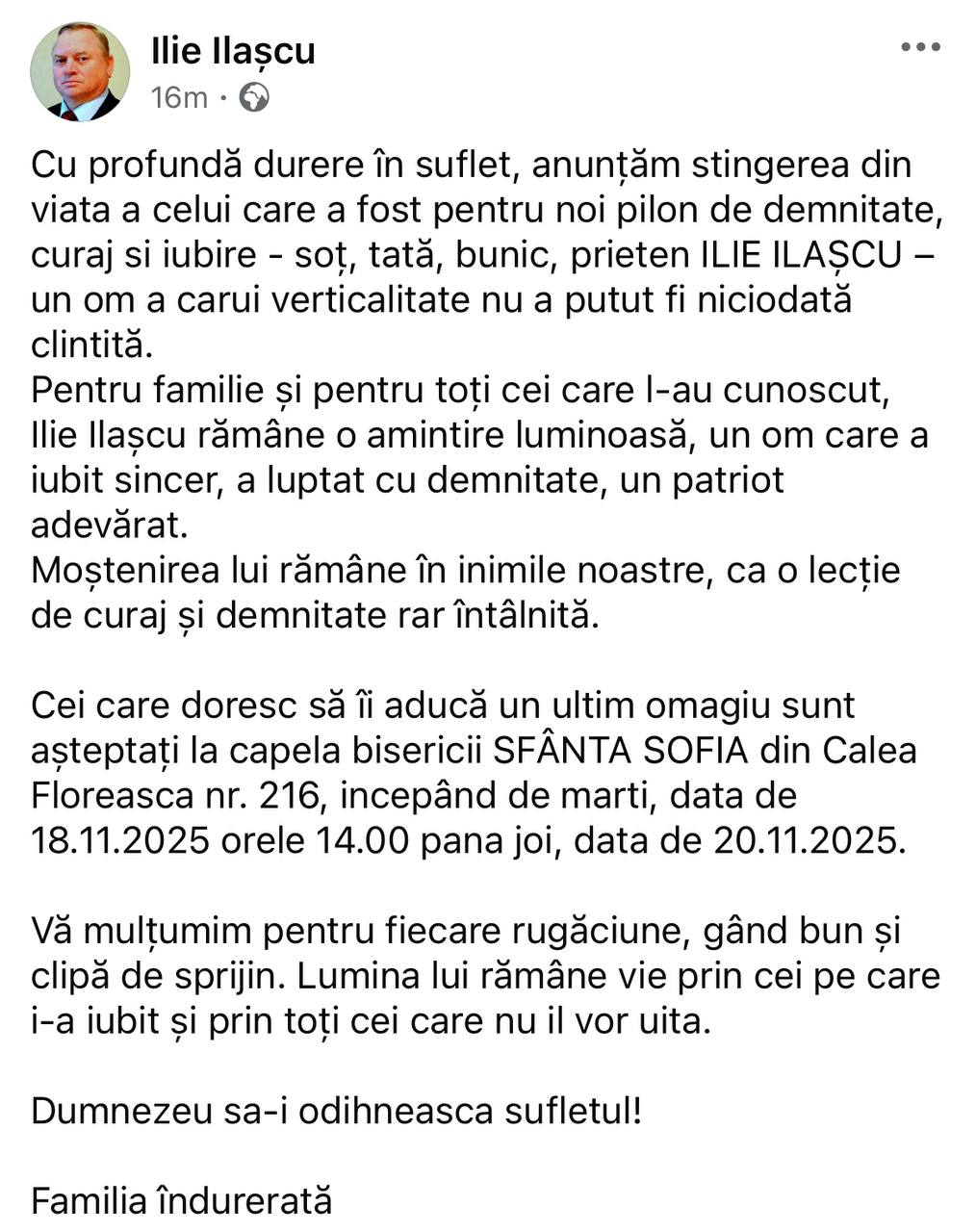 „Cu profundă durere în suflet, anunțăm stingerea din viață a celui care a fost pentru noi pilon de demnitate, curaj și iubire - soț, tată, bunic, prieten Ilie Ilașcu– un om a cărui verticalitate nu a putut fi niciodată clintită.