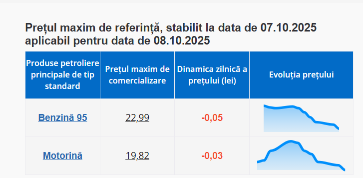 Prin urmare, un litru de bezină va costa mâine 22.99 lei, iar un litru de motorină - 19.82 lei.