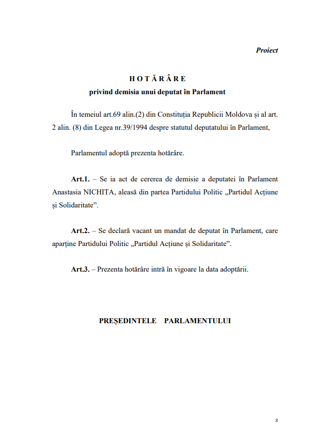 Anterior, SPPOT a scris că deputata PAS Anastasia Nichita ar urma să-și depună mandatul de parlamentar, la început de februarie.