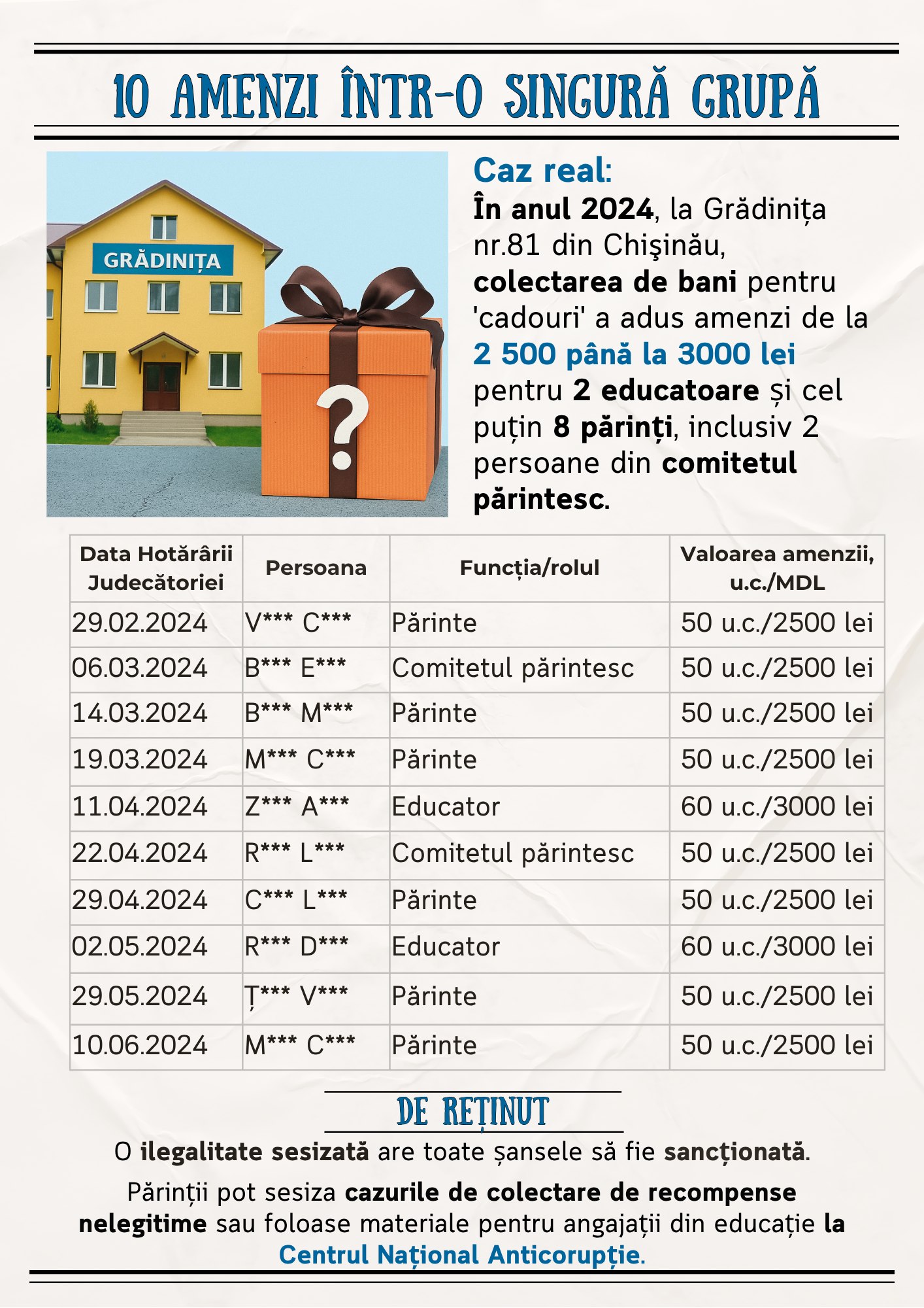 „Judecătoria Chișinău a stabilit că acțiunile de colectare și oferire de bani se încadrează în prevederile articolului 315, alineatul (2) din Codul Contravențional, care sancționează colectarea de recompense nelegitime sau alte foloase materiale destinate angajaților din domeniul învățământului.