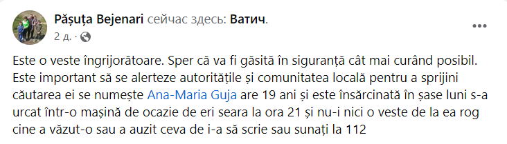 „Este o veste îngrijorătoare. Sper că va fi găsită în siguranță cât mai curând posibil. Este important să se alerteze autoritățile și comunitatea locală pentru a sprijini căutarea ei - se numește Ana-Maria Guja are 19 ani și este însărcinată în șase luni. Aceasta s-a urcat într-o mașină de ocazie de ieri seara la ora 21 și nu-i nici o veste de la ea. Rog cine a văzut-o sau a auzit ceva despre ea să scrieți sau să sunați la 112”, se arată în mesajul femeii.