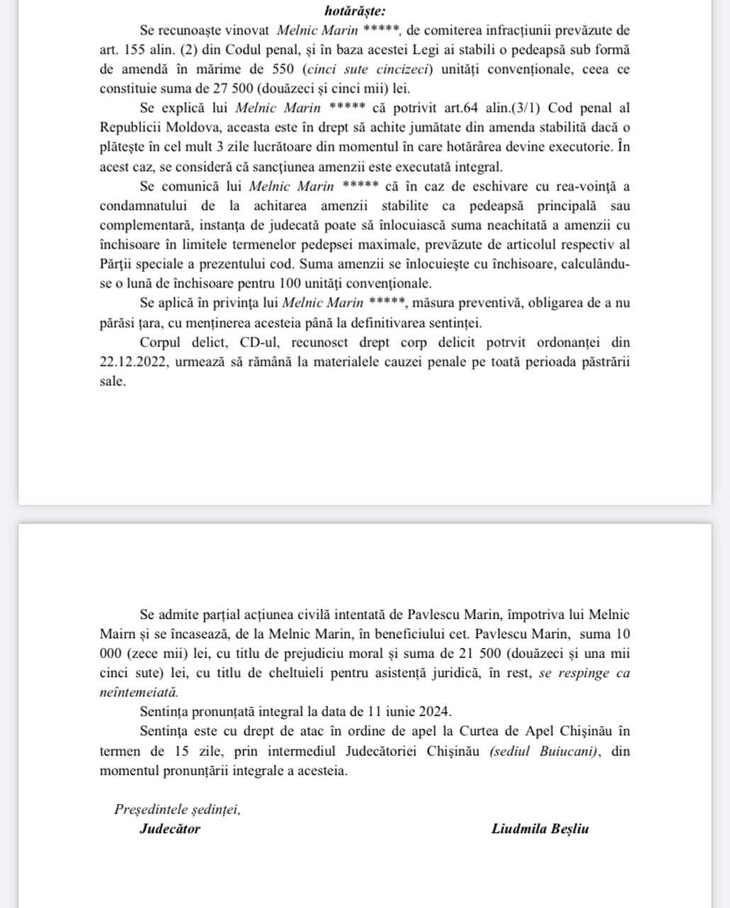 Suma amenzii stabilită de instanță, plus despăgubirile morale și cheltuielile de judecată se ridică la aproximativ 60 de mii de lei.