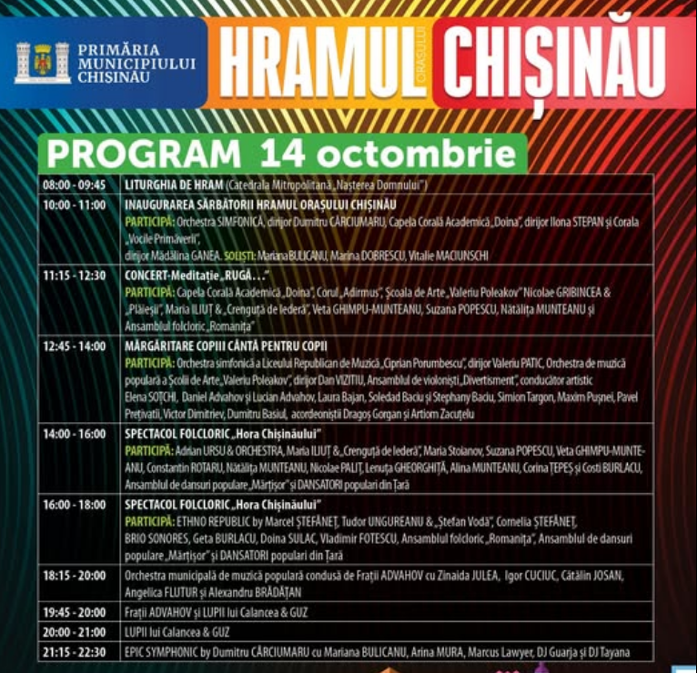 Potrivit programului anunțat de Primăria Chișinău, pe scena din PMAN vor evolua mai mulți artiști. Zinaida Julea, Cătălin Josan și Igor Cuciuc, printre invitați. Urmărește concertul live pe UNIMEDIA.