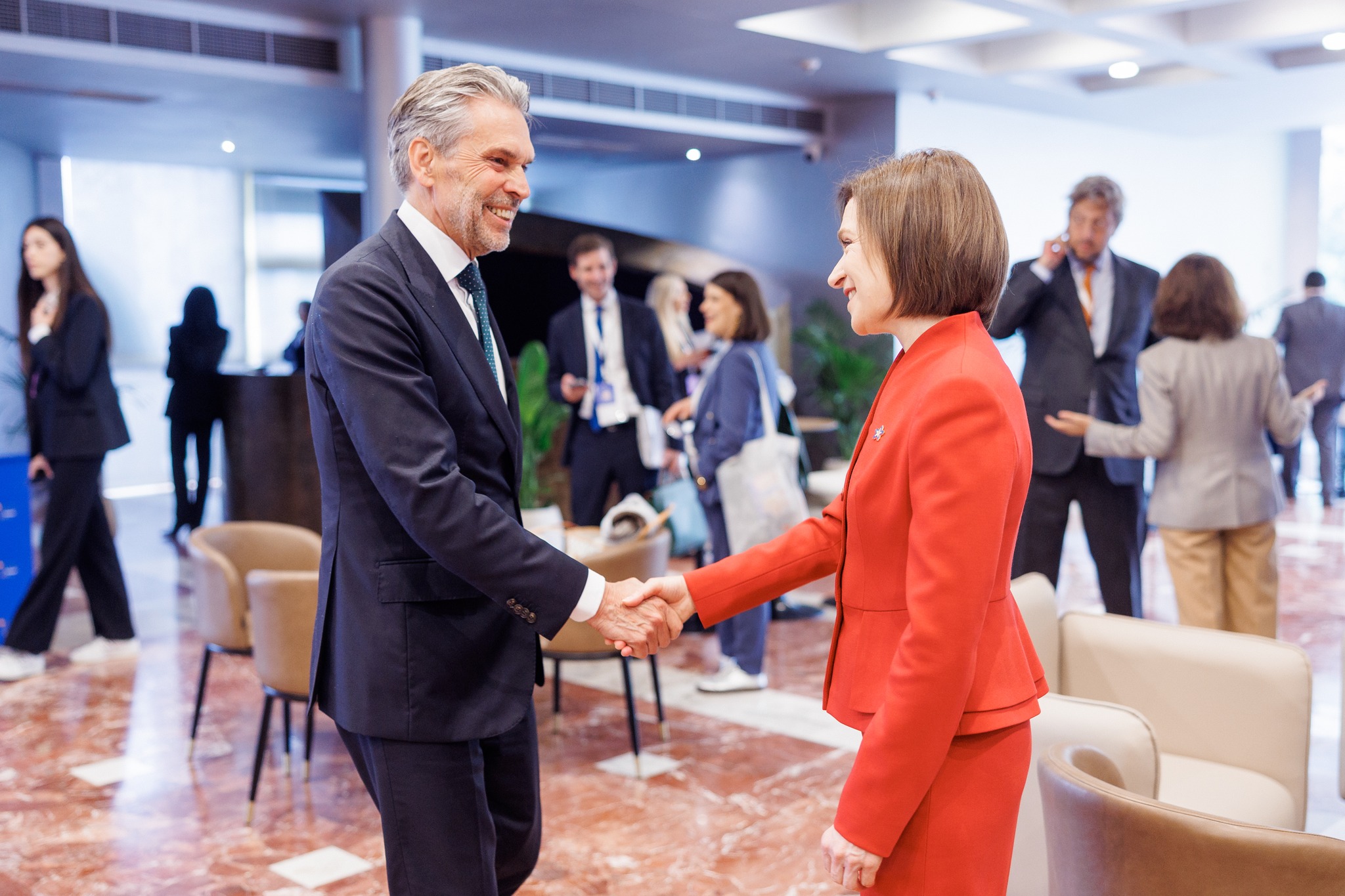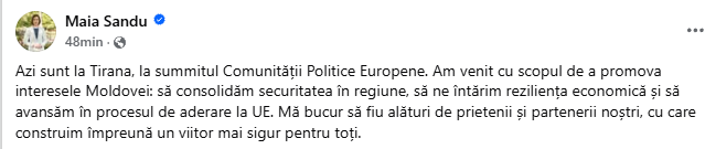 „Azi sunt la Tirana, la summitul Comunității Politice Europene. Am venit cu scopul de a promova interesele Moldovei: să consolidăm securitatea în regiune, să ne întărim reziliența economică și să avansăm în procesul de aderare la UE. Mă bucur să fiu alături de prietenii și partenerii noștri, cu care construim împreună un viitor mai sigur pentru toți”, a scris șefa statului pe rețele.