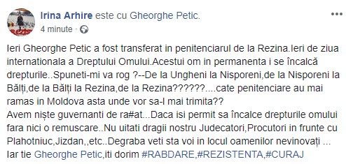 „Ghoerghe Petic a fost transferat ieri în Penitenciarul nr.17 din Rezina în baza încheierii instanței de judecată”, a menționat Oleg Pantea.